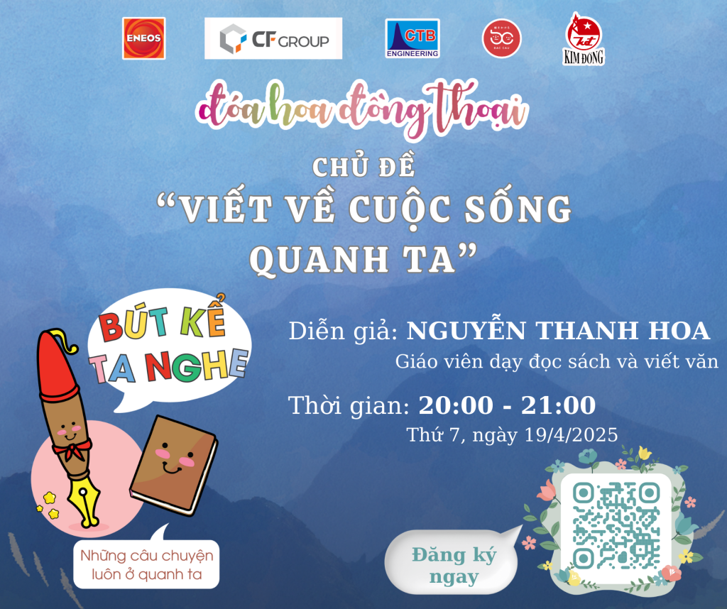 Tối 19/4/2025, buổi workshop online lần thứ 2 Bút kể ta nghe với chủ đề “Viết về cuộc sống quanh ta” đã diễn ra trong không gian ấm áp, giản dị nhưng cũng đầy cảm hứng. Sự kiện có sự đồng hành của diễn giả Nguyễn Thanh Hoa – người bạn lớn thân thiết của các bạn nhỏ yêu văn chương, cùng khách mời đặc biệt là tác giả nhí Nguyễn Ngọc Mai Thanh.